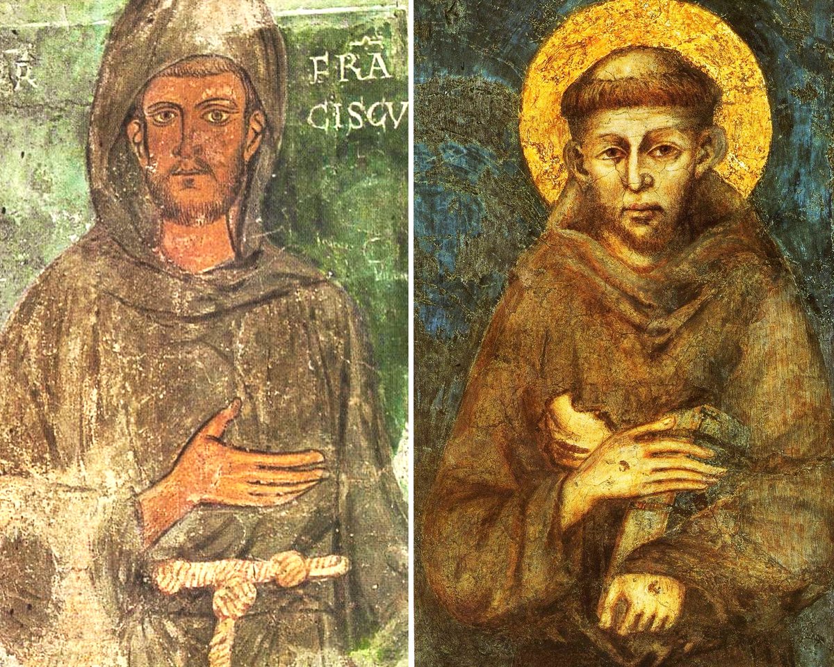 Lukisan pertama (sebelah kiri) ditemukan di Biara Benediktin di Subiaco Italia. Lukisan ini dibuat pada salah satu kunjungan St. Fransiskus ke biara tersebut. Dalam lukisan ini St. Fransiskus tidak digambarkan dengan lingkaran suci dan stigmata. Lukisan kedua (sebelah kanan) terdapat di Basilika bagian bawah Asisi dan dibuat oleh Cimabue. Lukisan lengkap menggambarkan Bunda Maria dengan Kanak-kanak Yesus, empat orang malaikat dan Santo Fransiskus.