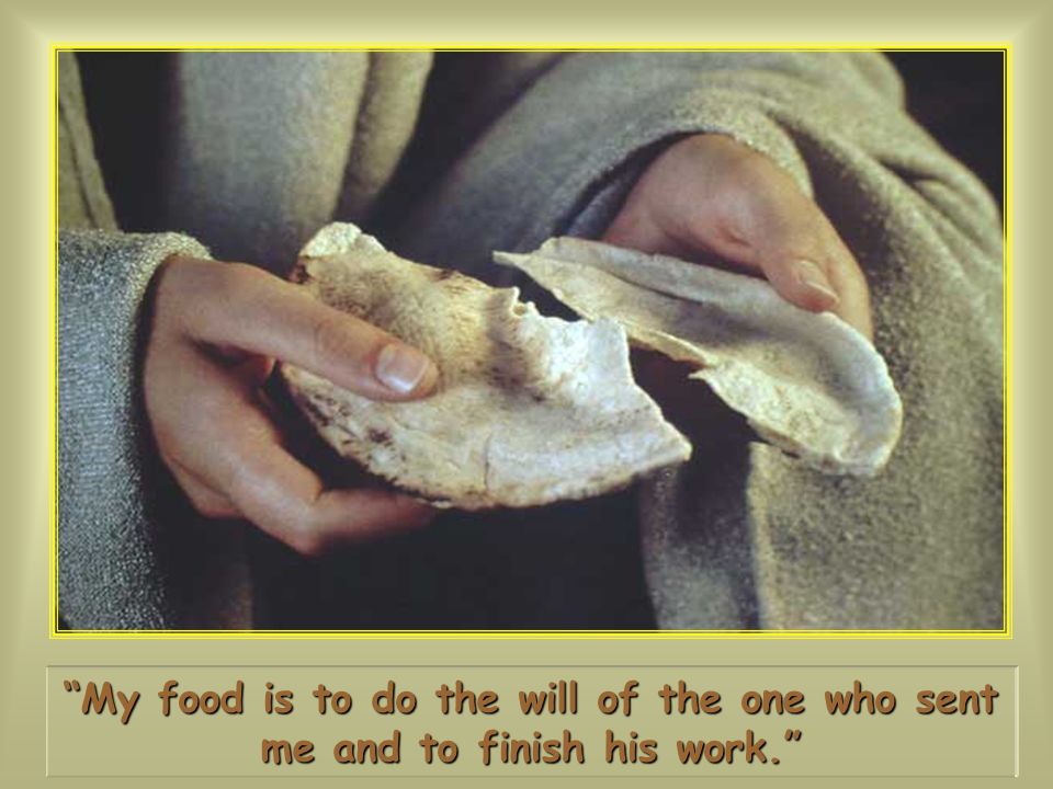 Murid-murid Yesus menawarkan makanan kepada-Nya. Namun, Yesus menegaskan bahwa dia sudah memiliki makanan, yang tidak mereka kenal. Sekali lagi, Yesus menggunakan kata yang bermakna ganda. Murid-murid memahami makanan sebagai produk duniawi, padahal yang dimaksud Yesus adalah melakukan kehendak Dia yang mengutus-Nya dan menyelesaikan pekerjaan-Nya.