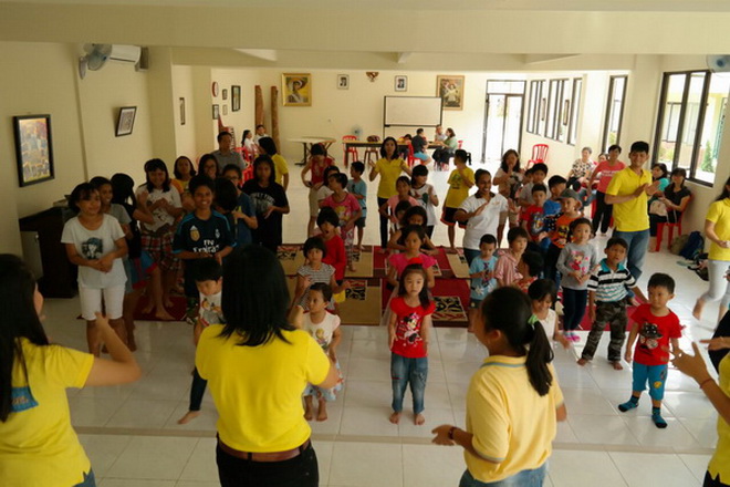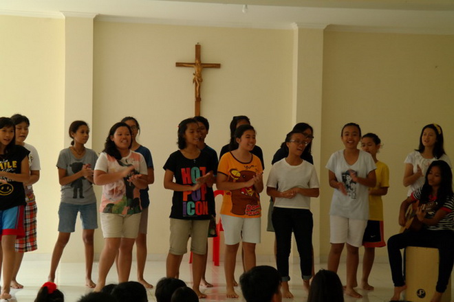Kami disambut dengan nyanyian oleh adik-adik di sana. Acara berlangsung seru. Kakak pembina juga mengajak semua adik-adik untuk menyanyikan lagu pujian. Semua ikut bergoyang termasuk para suster.