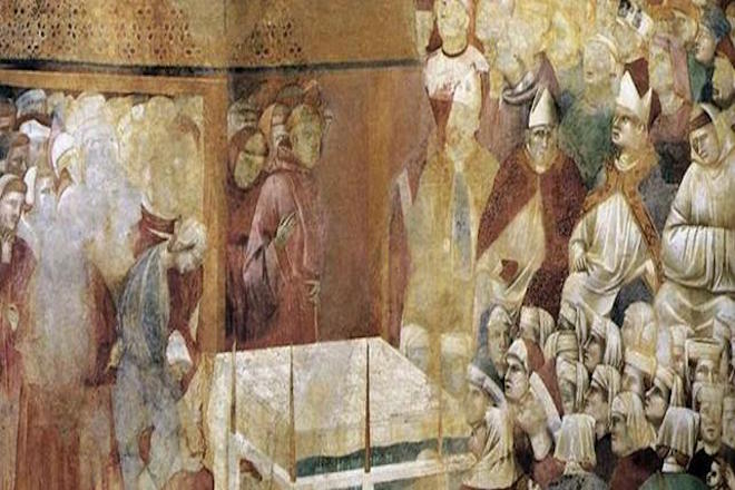 Pada 1219 di tengah berkecamuknya Perang Salib V, St. Fransiskus, menyeberangi garis pasukan Muslim untuk menemui Sultan Malik al-Kamil di kamp-nya di tepi Sungai Nil guna menawarkan perdamaian. Sang Sultan berkenan menemui St. Fransiskus, tidak hanya menemuinya bahkan terjadi sebuah dialog damai antara St. Fransiskus, Sultan dan para pasukannya. Untuk membuktikan kebenaran Injil, St. Fransiskus menyatakan diri sanggup meletakkan tangannya di atas api.