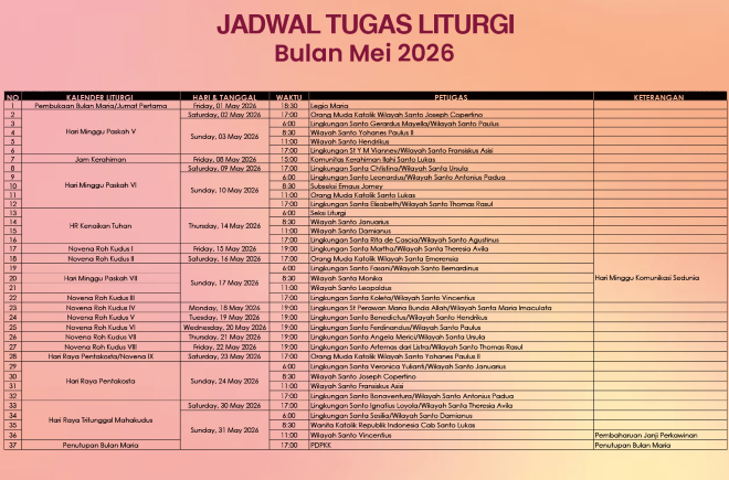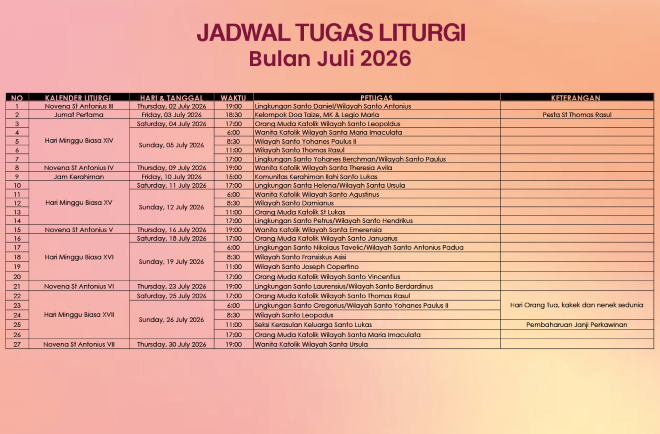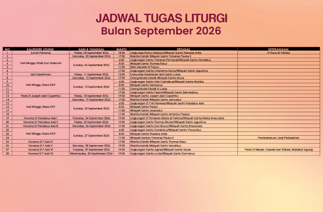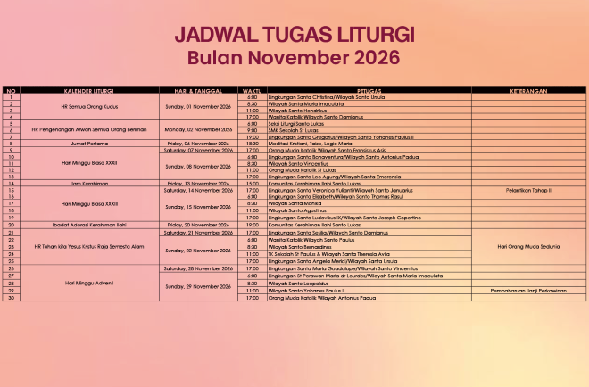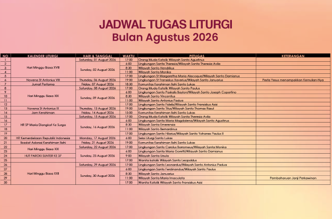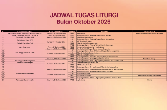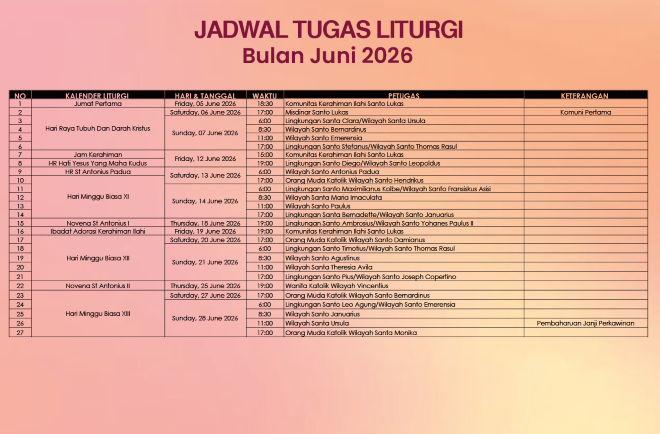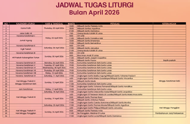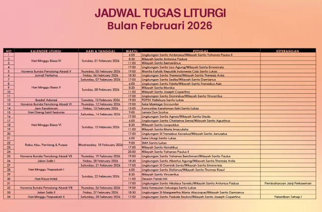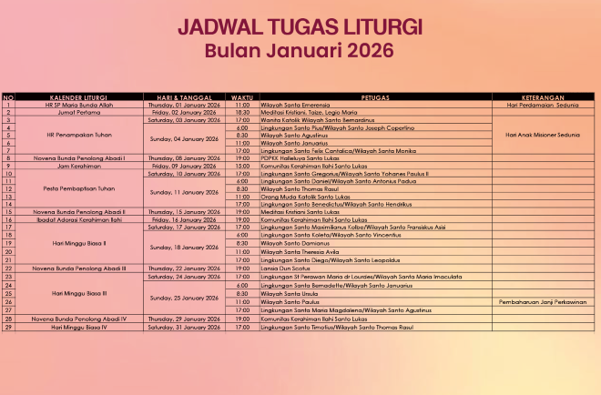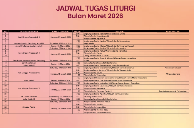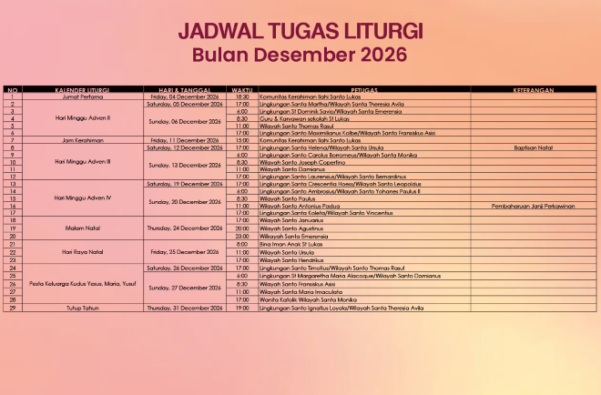 Kalender Liturgi & Jadwal Petugas 2026 dapat download disini